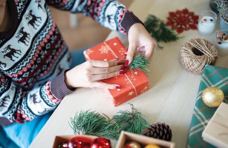 Instead of decorating your gifts with bought ribbons and bows, use natural twine, raffia or scraps of fabric. Make labels from last year’s cards, buy eco-friendly sticky tape and choose non-metallic gift wrap.