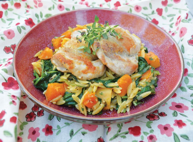 6. Add the washed spinach, leave it to wilt, then add the double cream.7. Fold in the cooked butternut squash and return the chicken to the pan. Heat through until piping hot, then garnish with more fresh thyme.