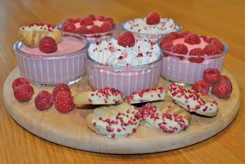 Raspberry mousse with white chocolate-dipped biscuits
