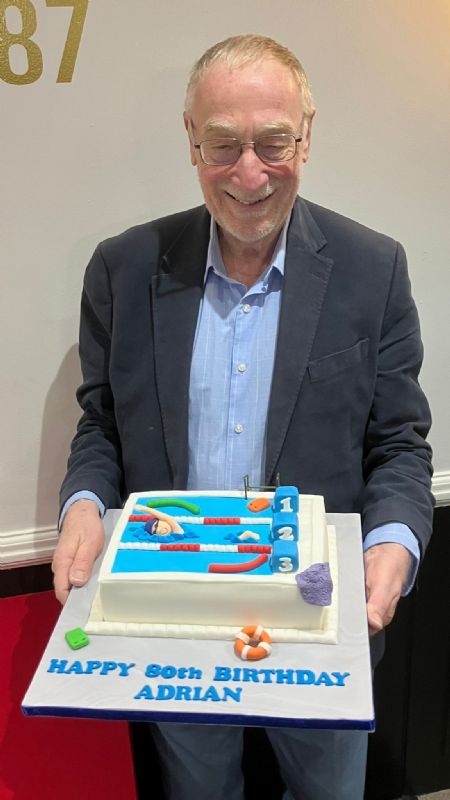 Lifelong Cheltenham Town supporter Adrian Bailey swam 80 lengths to celebrate his 80th birthday yesterday and raised £2,000 for a very good cause.