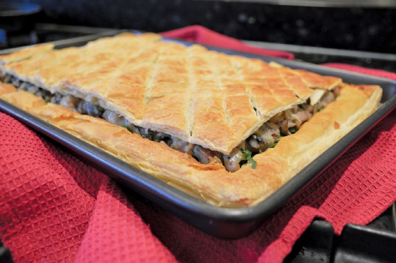 Tender chicken in a creamy mushroom sauce topped with a flaky golden pastry lid.